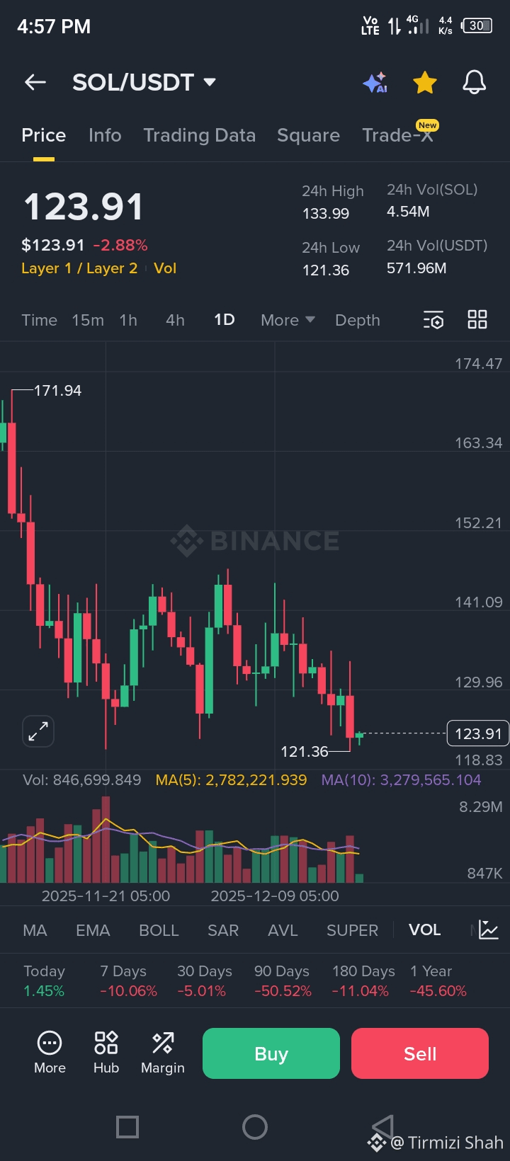 Solana ($SOL) is currently at a critical juncture, navigating significant volatility after a major recent high. As of today, the price is hovering near $123 - $127, with technical indicators flashing caution. The market is attempting to determine whether this is a healthy correction or the start of a deeper pullback.