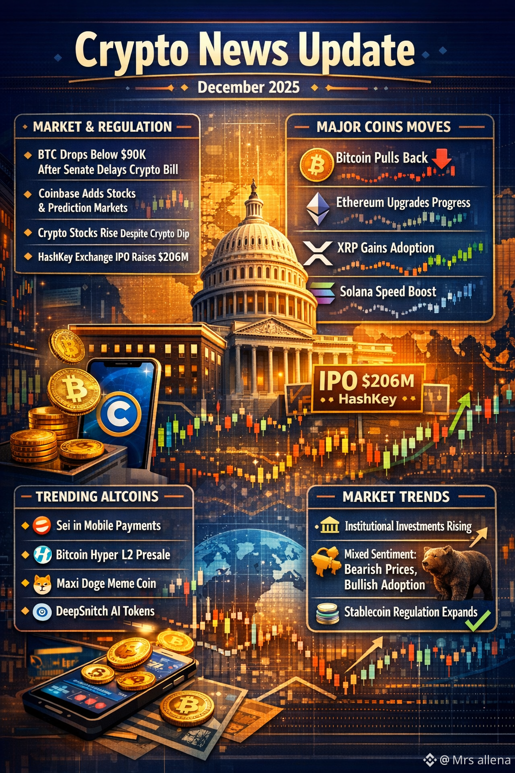 🔹 Bitcoin price volatility — BTC pulled back below ~$90K after the U.S. Senate postponed key crypto legislation, leading to market weakness and investor uncertainty.