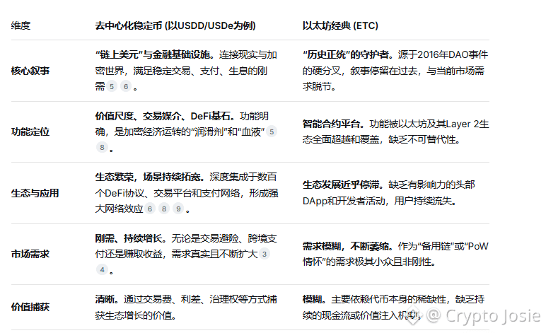 当所有人的目光都聚焦于比特币的涨跌、以太坊的ETF动态或是各类新锐公链的叙事之争时,一个被悄然证实的趋势正在加密市场深处发生:资金与注意力正在发生结构性转移。一面是以USDe、USDD为代表的去中心化稳定币(Decentralized USD)高歌猛进,凭借清晰的用例和创新的机制吸纳海量资金;另一面,则是如以太坊经典(ETC)等一批缺乏新叙事支撑的老牌项目,在慢熊市中滑向“资金真空区”,流动性持续枯竭。