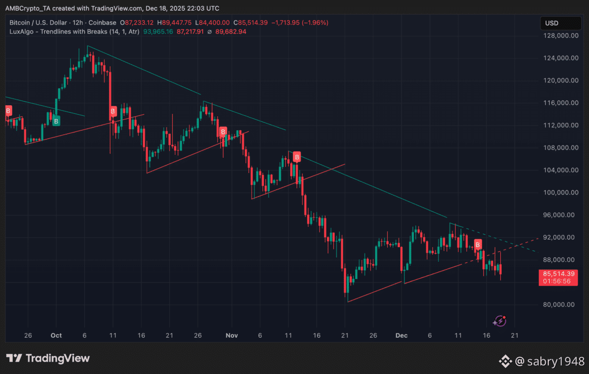 شهد خط الاتجاه التنازلي متعدد الأشهر اختبارات متعددة خلال الشهر الجاري، مع رفض في كل مرة، وكان الرفض الأخير قرب مستوى 90 ألف دولار سبباً في تجدد عمليات البيع، مما دفع السعر إلى نطاق توحيد أدنى. يظل الزخم ضعيفاً، مع صعوبة في بناء اقتناع صعودي قوي.