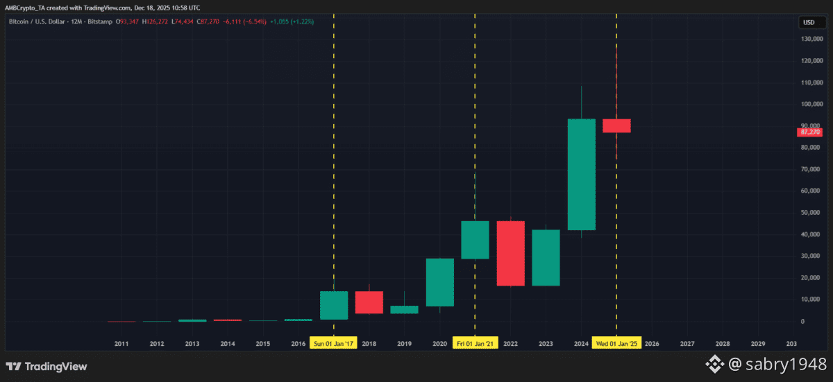 حدث التنصيف الأخير في أبريل 2024، مما خفض مكافأة الكتلة إلى 3.125 بيتكوين. بعد حوالي 18 شهراً من التنصيف (حتى نهاية 2025 تقريباً)، يتجه البيتكوين لإغلاق عامه الأول ما بعد التنصيف بانخفاض يقدر بنحو 7%، وهو أمر غير مسبوق مقارنة بالدورات السابقة التي شهدت مكاسب قوية في السنة الأولى (مثل 60% بعد تنصيف 2020).