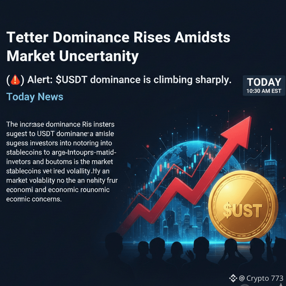 Tether (USDT) dominance is experiencing a significant climb today, indicating a potential shift in investor sentiment within the cryptocurrency market. This sharp increase often suggests that investors are moving their assets into stablecoins, seeking refuge from volatility in other digital assets. The move into USDT could be a reaction to broader market uncertainty, economic concerns, or anticipation of future market movements. Analysts are closely watching this trend to gauge potential implications for Bitcoin and altcoin prices.#USDT🔥🔥🔥 #BinanceBlockchainWeek #USJobsData #CryptoRally