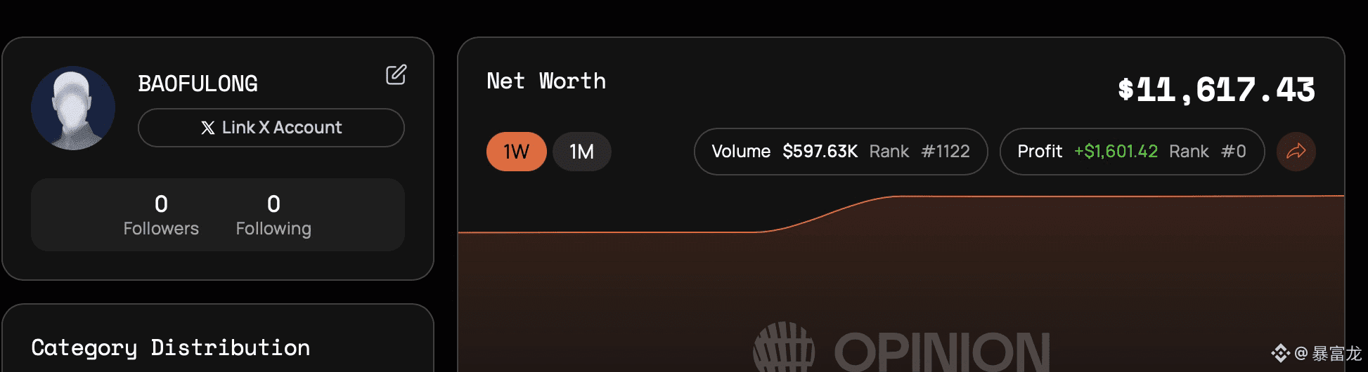 BNB链的三个平台是重点,因为大概率会上币安,Opinion推出已经1个多月了,目前交易量赶超polymarket势头,重点做,我目前刷到了1122名,争取进1000名,还盈利了1600刀,排名保持住。