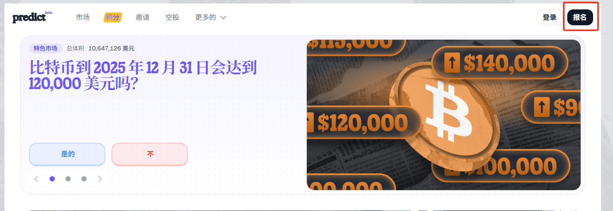 首先进入官网:https://predict.fun?ref=A20B6 ,点击右上角的注册,用邮箱/推特直接注册就行。