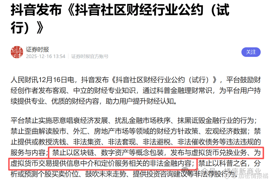 就在前天,抖音出了一个《财经行业公约》,里边明确提到禁止以区块链、数字资产等概念包装,发布与虚拟货币兑换业务、为虚拟货币交易提供信息中介和定价服务相关的非法金融内容。