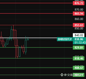 BNB今天留意840这个位置,只有4小时级别站稳此位置上方,那4小时级别才开始走反弹行情,往上上方压力位留意853-866-876这几个位置附近!