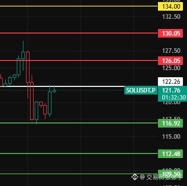 SOL今天留意122这个位置,只有4小时级别站稳此位置上方,那4小时级别才开始走反弹行情,往上上方压力位留意126-130-134这几个位置附近!