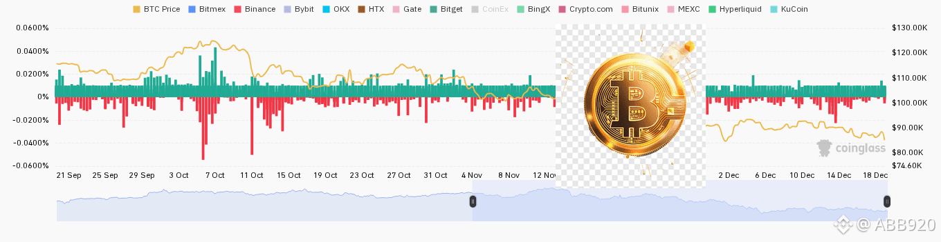 Nhưng mà sang tháng 12 này thì khác bọt hẳn! Giá BTC lại có pha trượt dài từ khoảng 100K về gần 80K. Nhìn cái đường giá mà cứ muốn thở dài! Phí funding cũng phản ánh đúng tâm trạng anh em: lèo tèo, thậm chí có những cây đỏ đậm xuất hiện. Rõ ràng là phe Short đang có chút lợi thế, hoặc ít nhất là phe Long đang "hồi hộp" lắm rồi.