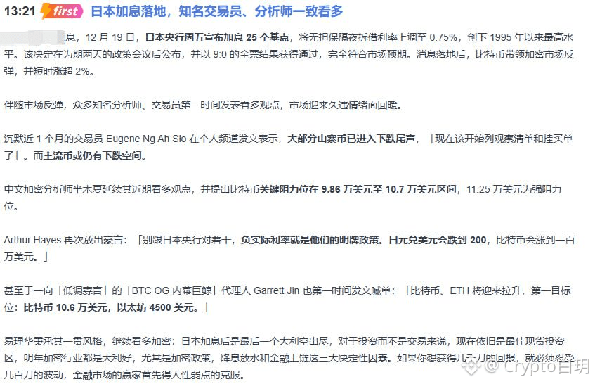 刚刚发生了一件大事!日本央行那边宣布加息了,利率调到0.75%,创了几十年来的新高。按理说这是收紧钱袋子,对市场算是个压力对吧?但咱币圈就是这么魔幻,消息一落地,比特币带着大盘直接一个抬头,短时蹭蹭涨了超2%!这到底是为啥?听我给你掰扯掰扯。