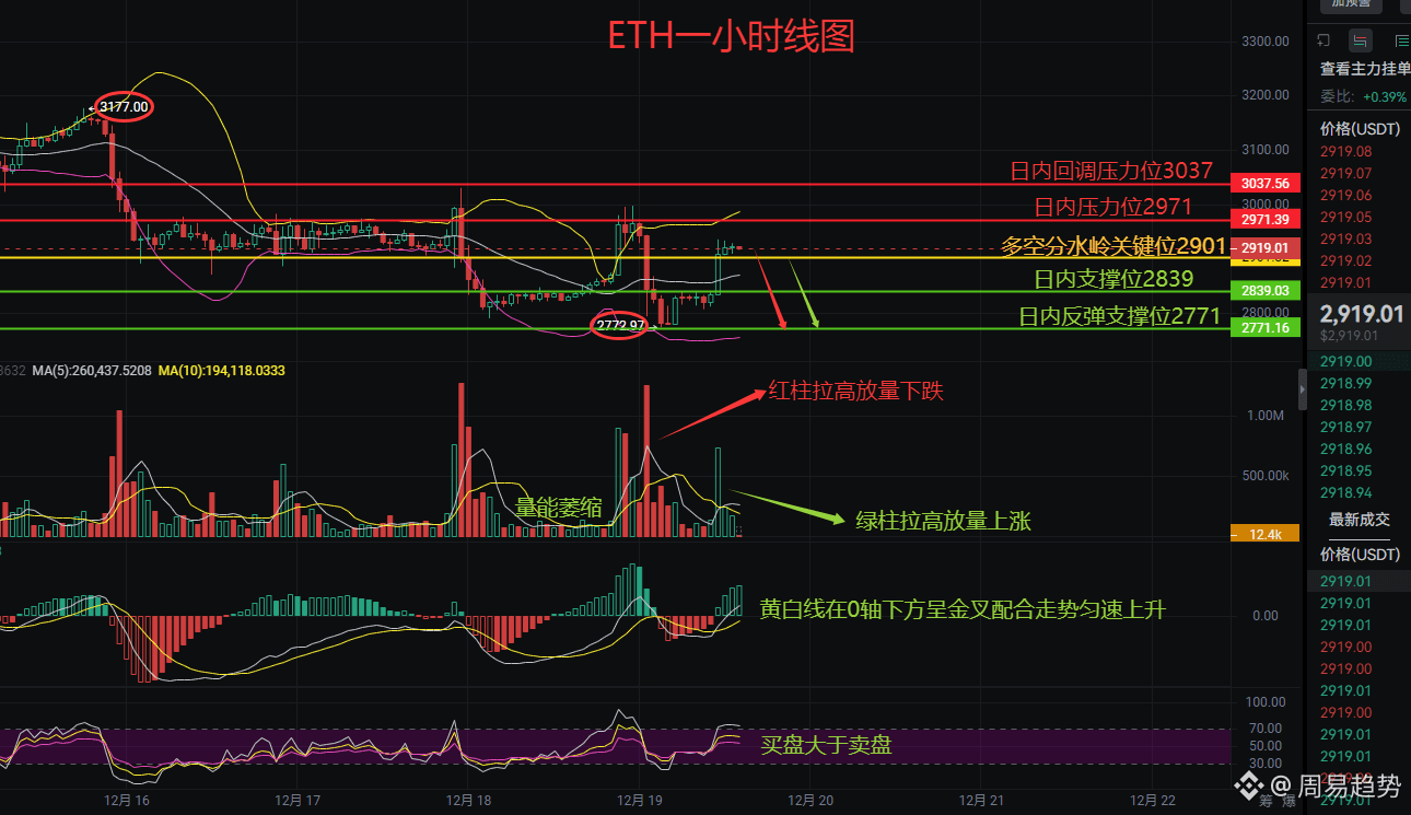 从一小时图看,ETH目前处于下跌趋势,虽然MACD在0轴下方金叉,看似有反弹动力,但记住——0轴下方金叉,往往是下跌中的喘息,不是反转信号!