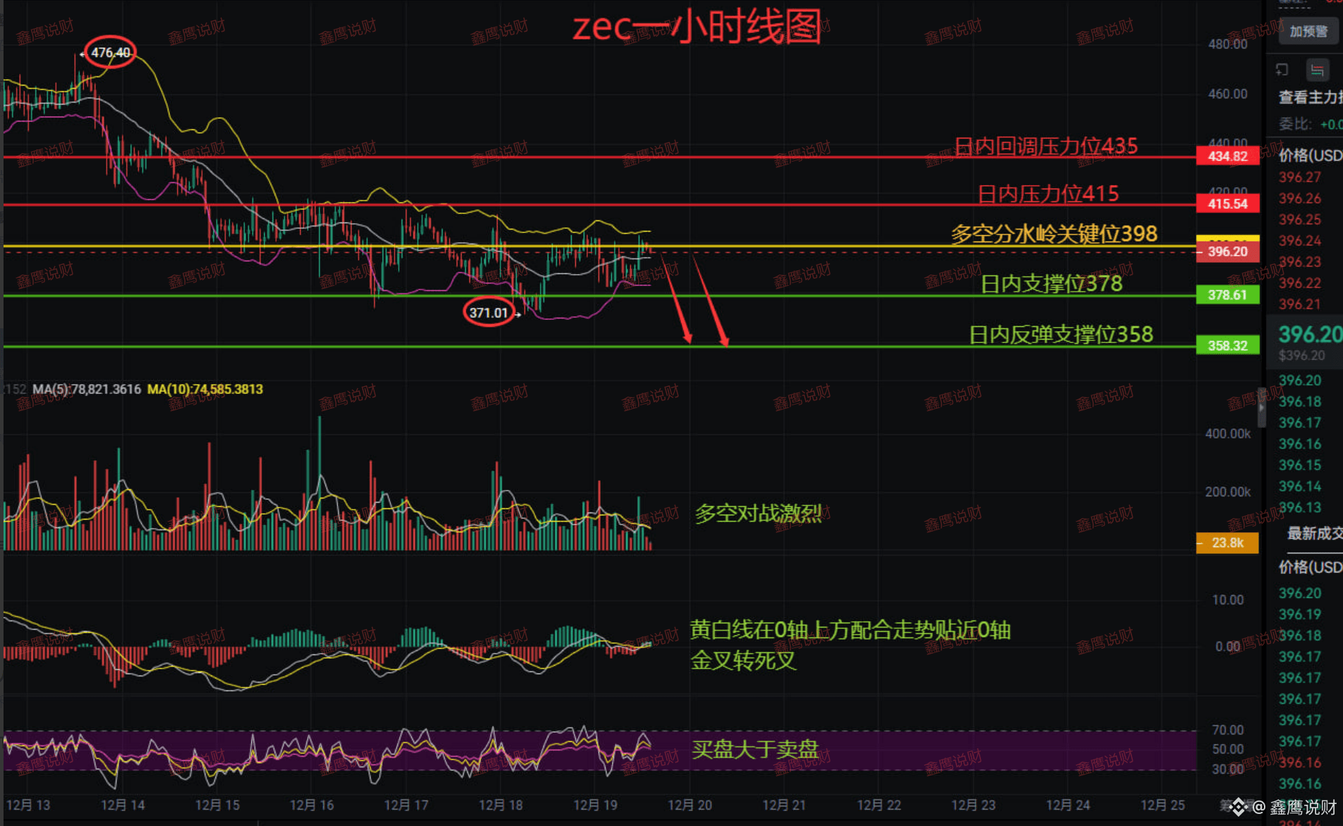 各位,鑫鹰盯盘来了!ZEC一小时线走得那叫一个纠结,多空在398关键位附近来回撕扯,上下两难。表面风平浪静,实则暗藏杀机。
