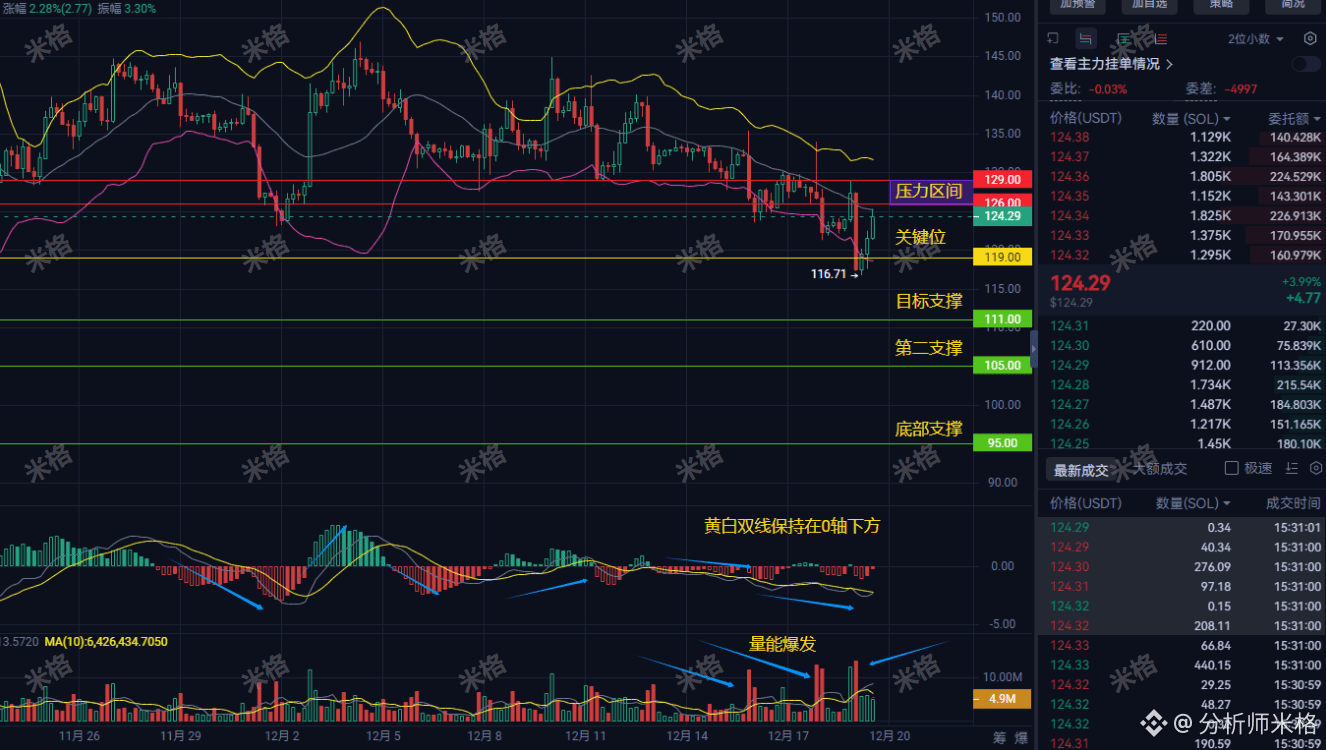 米格观点:短期可能还会向上冲一冲,试探126甚至129,但如果量能跟不上,冲到那附近就是诱多!看作最后一次尝试空单的机会,没到就千万别追如果连126都过不去,掉头跌破119,那小级别反弹基本就结束了,下一站很可能就是111,甚至105、95。多单不是不能做,但一定要等第二、三支撑附近再轻仓试。
