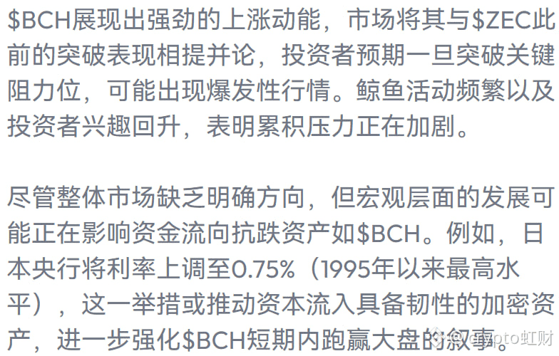 市场情绪也在悄悄升温。最近BCH被不少人拿来和ZEC之前的突破走势对比,鲸鱼动作频繁,资金兴趣明显回暖。更值得留意的是宏观层面日本央行加息到0.75%,是1995年以来最高!这可能会促使部分资金寻找抗跌性强、有独立行情的资产,BCH恰好符合这个叙事。