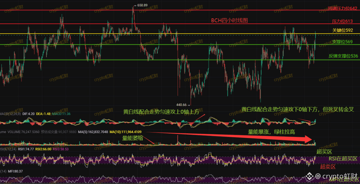 从一小时K线来看,BCH整体还在上涨趋势里,但细节处已经开始讲故事。MACD黄白线在0轴下方匀速运行,看似疲软,但注意死叉正在悄悄转向金叉!这是什么意思?就像长跑选手途中换气,短暂的放缓可能是为了后续更有力的冲刺。