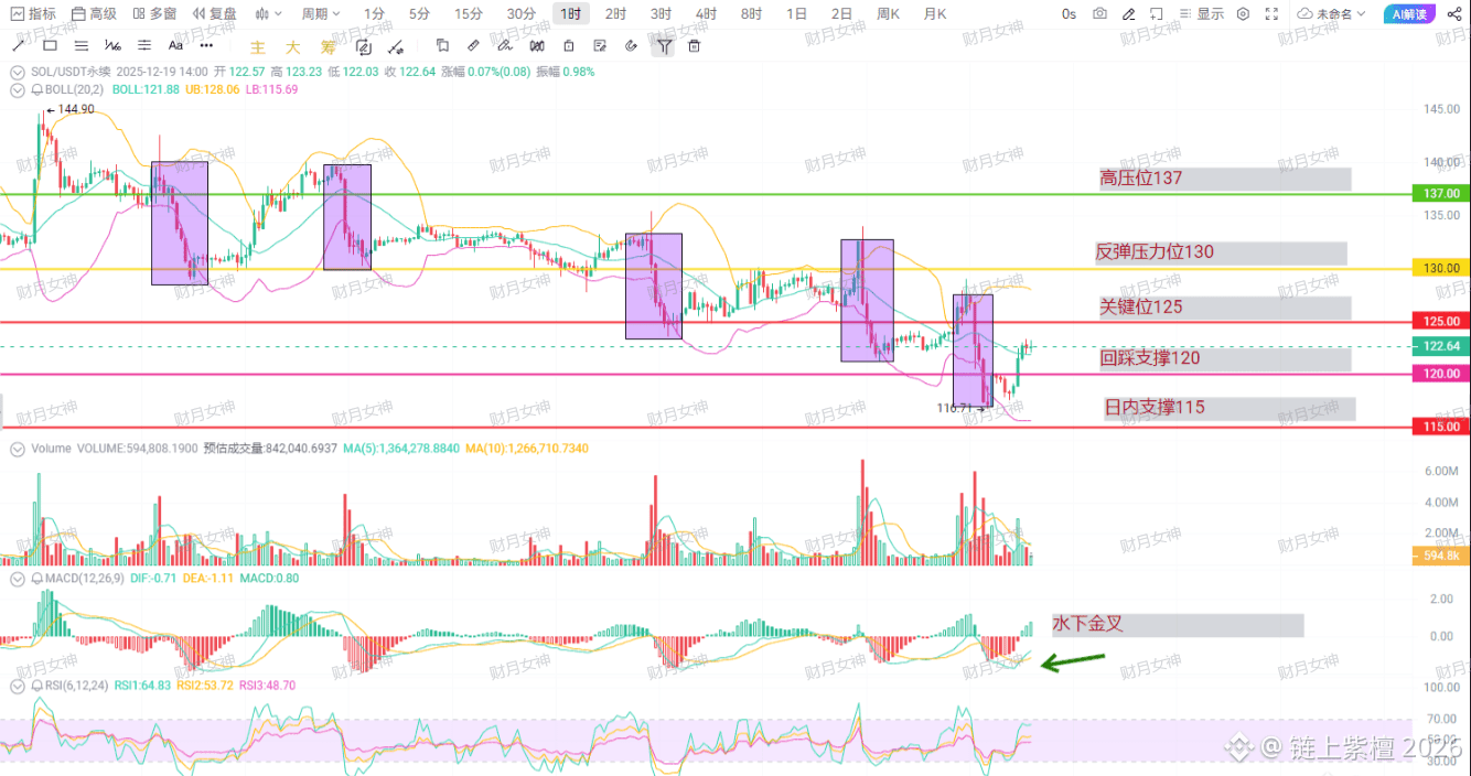 现在 SOL 卡在 122 附近,上面 125 是 生死线,这位置冲不上去,那反弹就是 虚晃一枪;