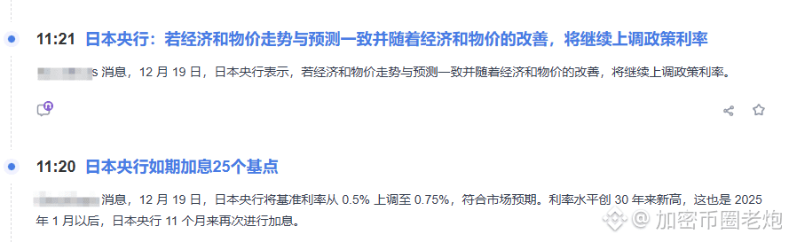 这句话,对金融市场来说并不友好。它意味着什么?意味着这不是一次性动作,而是一个可能延续的加息周期。而一旦日本继续收紧,日元套利交易被迫退潮,全球风险资产都会被动承压,加密市场当然也跑不掉。#比特币流动性