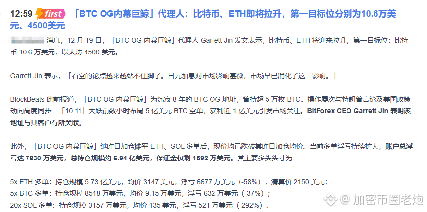 因为市场正在上演一个典型的“情绪拉升”——加息落地 + 圣诞临近,多头需要一个理由把价格抬上去。再配合所谓的「BTC OG 内幕巨鲸代理人」出来公开喊话大涨,本质就是给情绪加一把火,让追高的人进场,让筹码完成转移。