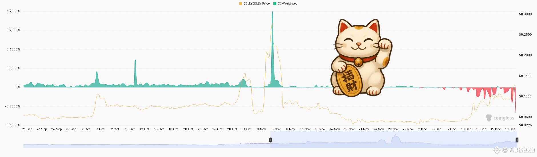 Anh em ơi, nhìn con JELLYJELLY này mà xem, đúng là một cuộc đời sóng gió! Hồi cuối tháng 9, đầu tháng 10 thì cứ lờ đờ, chán òm. Ai dè cuối tháng 10, đầu tháng 11, nó làm cú thần tốc, bay vút lên tận đỉnh gần 0.3 đô la Mỹ. Cái đường xanh xanh (OI-Weighted) lúc đó cũng bật cao chót vót, y như anh em mình fomo đua nhau vào long vậy đó! Ai mà bắt được kèo này chắc no bụng mấy bữa liền.