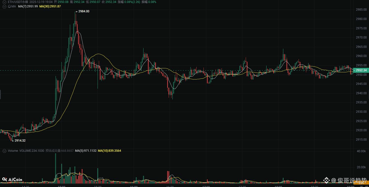 刚刚仔细看了下这张ETH的K线,这走势,有点意思。2025年12月19号晚上七点这根线,开盘2950.08,收盘2952.34,就涨了2块多,涨幅0.08%,跟没动似的。但看盘面,故事可不止这么点。早盘那波冲刺看到了吧,瞬间怼到2984,这说明什么,说明上面有资金想试探,有冲动,但结果呢,没站稳,立马就被拍回来了,在2950到2980这个窄区间里来回晃荡,典型的“插针”后回归平静。