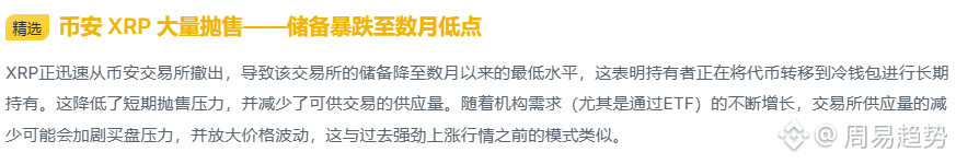 我是周易!XRP一小时线图上不去下不来,搞得人心痒痒!但你知道吗?币安XRP储备已经跌到几个月最低——大户正在默默囤币跑路!这到底是埋伏信号,还是暴风雨前的宁静?别急,周易用技术和消息面给你掰扯明白!