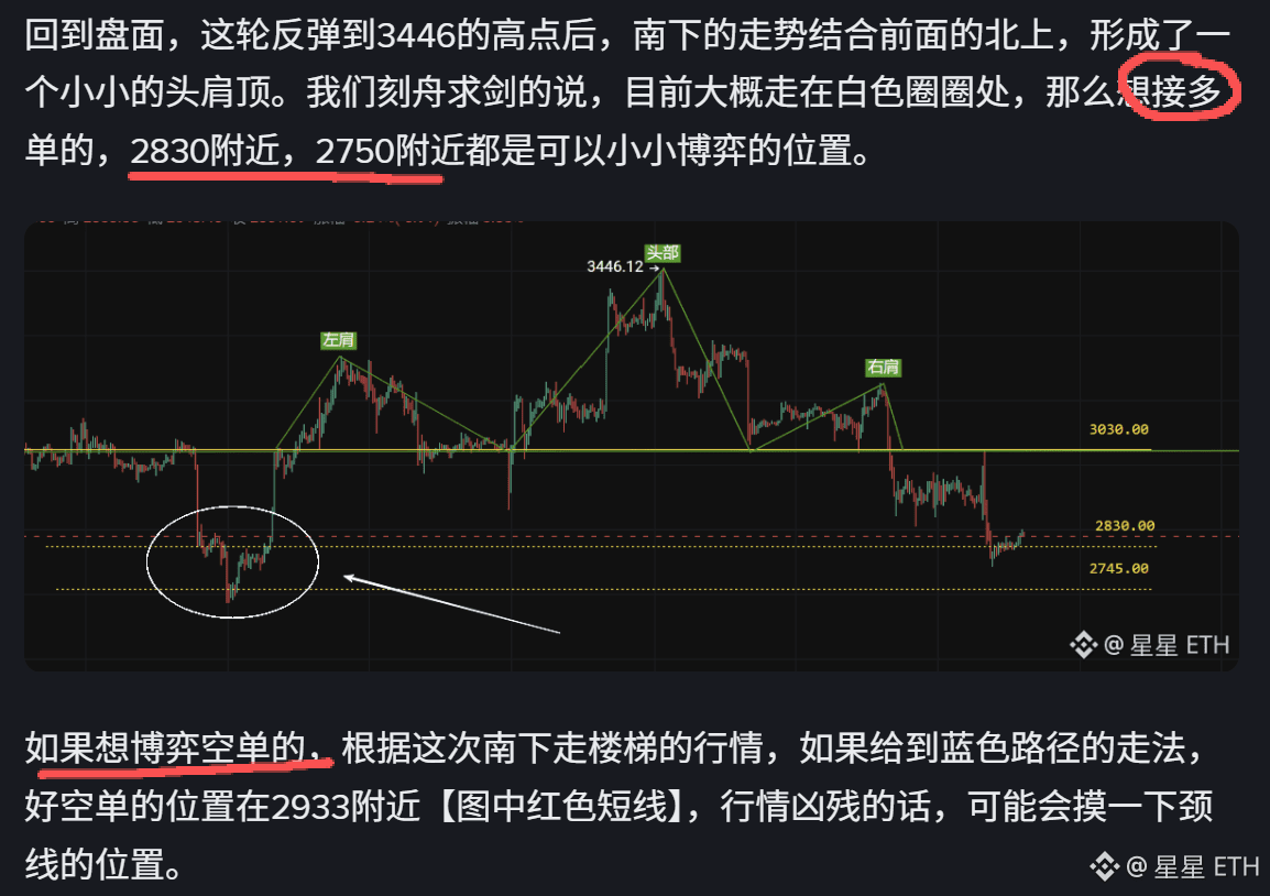 昨日速析的以太布局,空单给的是2933附近,同时防一手颈线3030位置。这个空单昨天盘面是给到的,头仓补仓过后均价大概在2960附近。凌晨1点20,价格大概在2800附近就给大家信号出掉这个空单。早晨起来2820走掉也赚不少的。