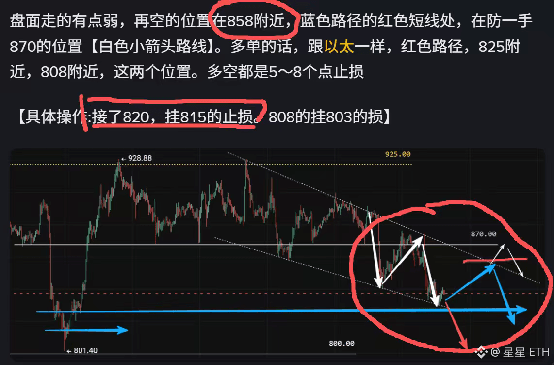 $BNB 昨天晚间布局的BNB,858的空单,盘面给到854附近,差4个点,手动追的位置在849,最后822走掉的。同时多单820上车,目前应该是有持仓。这里再走一点啊,留一点点仓低,