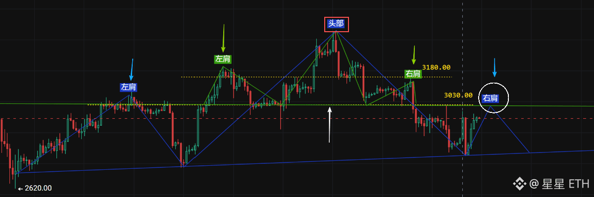 上图是两个头肩形,白色圈圈的右肩还没有打出来,做空单的位置就是去找一下这个右肩,理想的右肩高度在3030那个颈线位置,盘面如果弱势那就3000,凶残的话3080,3180都有可能。