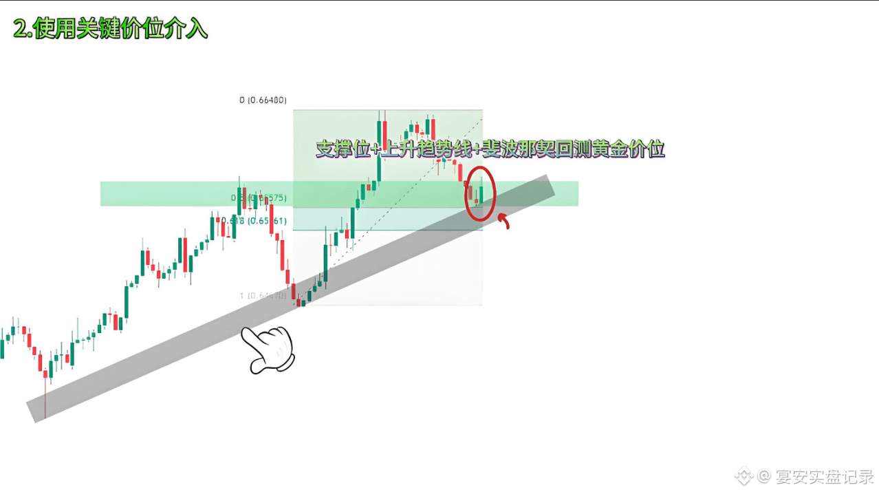 确定了上升趋势,也不能随便入场。咱们要找的是多重技术共振的关键价位——你看这个案例里,价格回调到了“前期高点突破后的支撑位+上升趋势线+斐波纳契黄金回调位”,三个技术点叠在一起,这就是超强的关键支撑位,价格在这里反弹的概率极高。