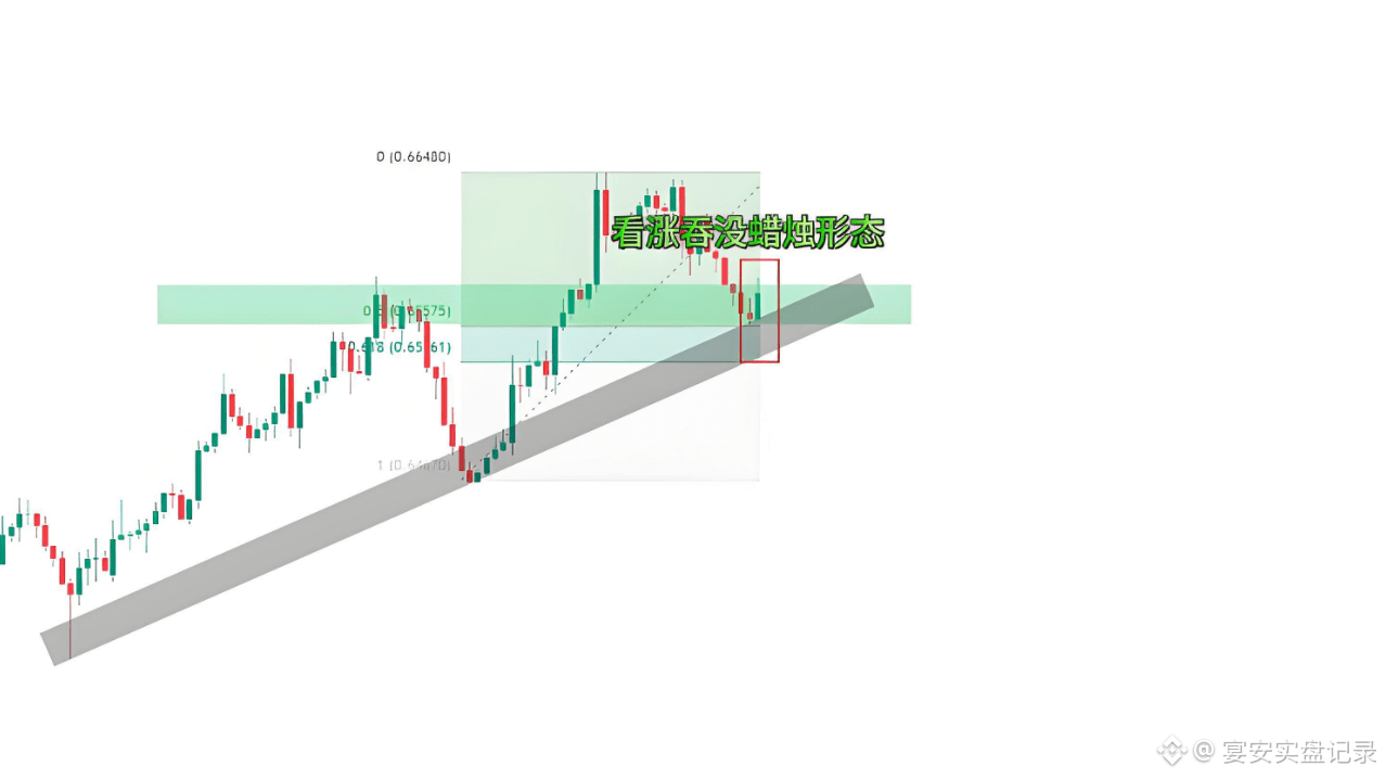 关键价位到了,别急着动手,等一个确认信号。我一般等K线形态,比如这个案例里的看涨吞没形态——阳线实体完全覆盖前一根阴线,说明多方动能强劲,价格要反弹了。这时候入场,才是高胜率、高盈亏比的好单子。