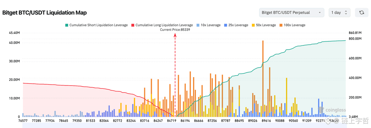 从期权到期日仓位分布看,市场分歧大。看涨期权集中在10万和12万美元执行价,部分投资者期待年底反弹;但空头短期占主导,看跌期权在85,000美元高度集中,该价位附近未平仓合约规模约14亿美元。按“最大痛点”理论,价格可能趋向85,000美元,此价位或对现货价格形成“引力效应”。