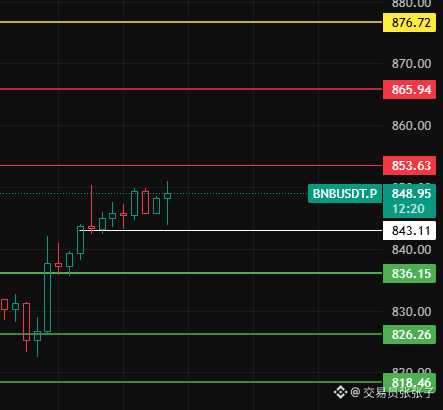 如果夜间1小时级别收线破不了843这个位置,那多头趋势依旧在,继续往上先看前高853,破不了小级别会回踩,破了上方压力位留意866-876-892这几个位置附近!#BNB走势