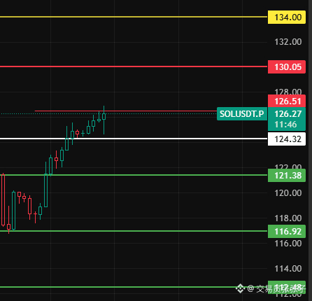 SOL夜间留意124这个位置,只有回踩跌破此位置1小时级别才开始回调,下方支撑位留意121-117-112这几个位置附近!