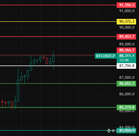 如果夜间1小时级别收线破不了87700这个位置,那多头趋势依旧在,继续往上先看前高88366,破不了小级别会回踩,破了上方压力位留意89450-90370-91350这几个位置附近!#BTC走势分析
