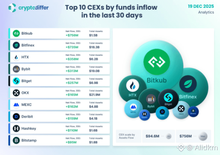While platforms like OKX, Bybit, and Bitfinex remain dominant by total assets, their net inflows are under pressure. This often happens during periods of market uncertainty or tighter risk conditions.