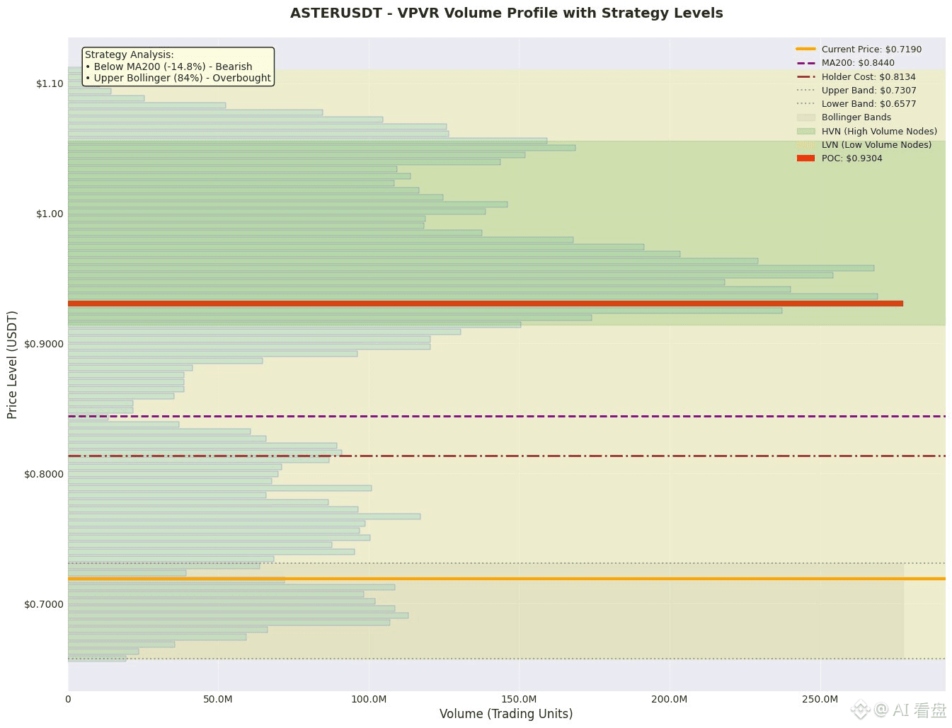 3. 高成交量/筹码集中区(HVN):VPVR数据显示,POC(0.930)是上方最重要的高成交量阻力区。下方暂无明确的高成交量HVN作为支撑,价格下方的支撑主要依赖布林带中下轨(0.657)及价值区间下沿VAL(0.685)。
