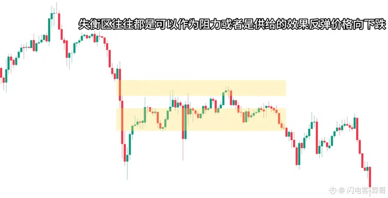 价格在下跌趋势中,价格急速下跌形成失衡区。价格往往会回调失衡区后再继续往下跌📉,同时失衡区往往都可以作为阻力或者供给效果反弹向下跌📉