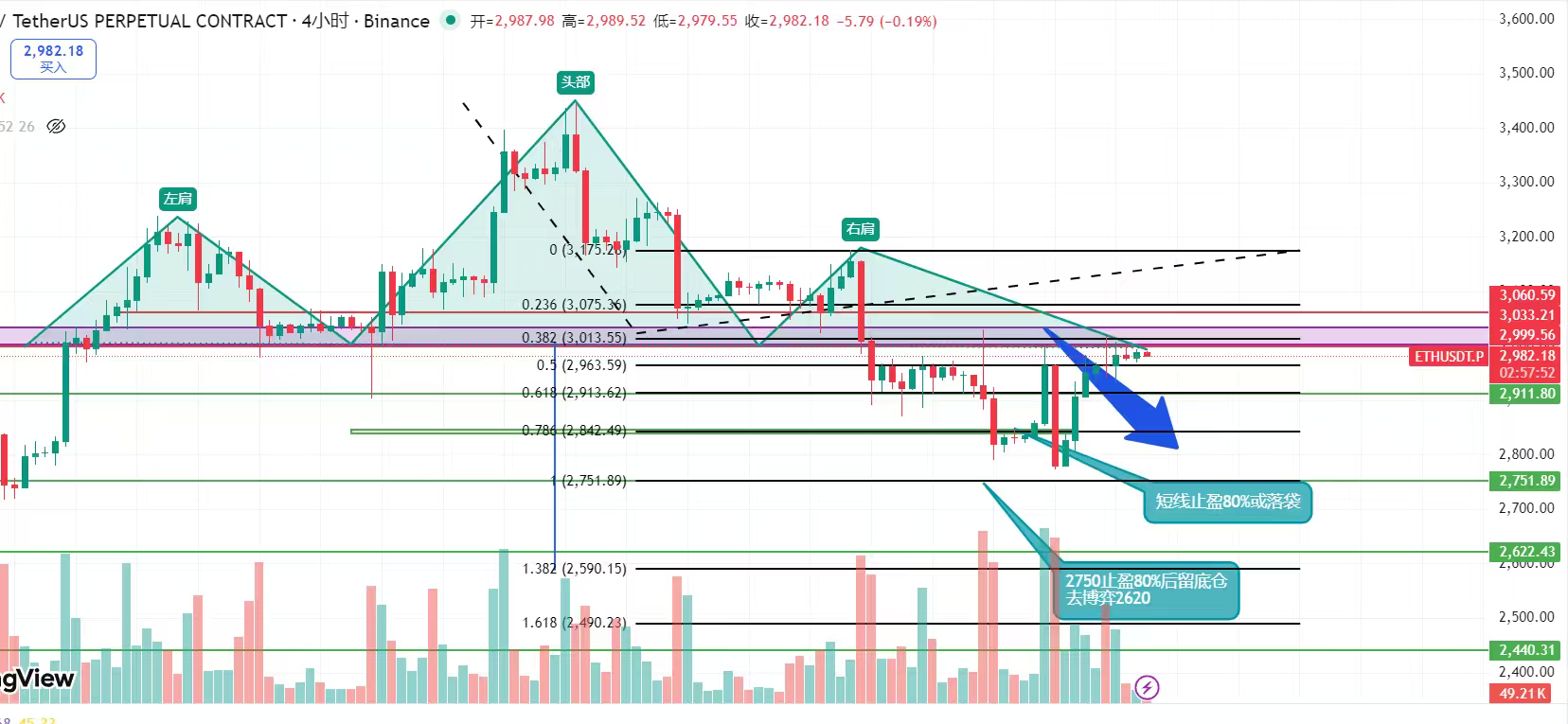 以太坊价格在2800-3050美元区宽幅间震荡,目前盘面中已经形成头肩顶,颈线3000~3060区间被测试几次都被打下来了,充分说明头肩顶已形成,理论上是要去测试一次2630附近,目前上方短期阻力分别是:3020附近斐波那契0.618位置压制,以及3060~3080附近日线一目均衡表基准线直线压制,下方阻力为2915附近以及2840~2790以及一直强调的2750附近抵达建议减仓80%,后再去博弈2620附近!