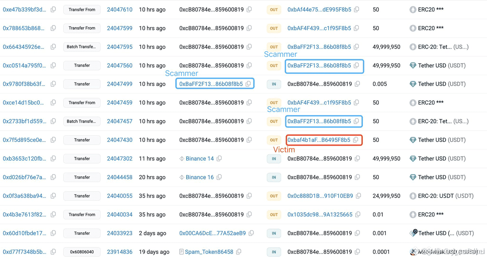 🔹 Victim sent 50 $USDT test transaction to his own wallet (0xbaf4…F8b5) ✅