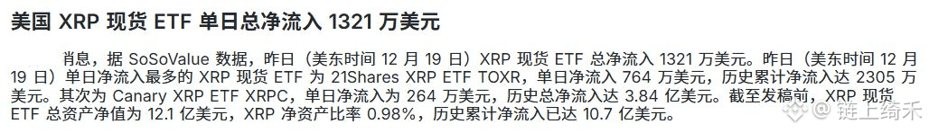 第一张图,是“钱”的流向。美国XRP现货ETF,昨天一天就净流入了1321万美金!这可不是小打小闹,这是真金白银、机构大资金在往里冲。尤其是累计都流入了10.7亿美金了,说明啥?说明有大老板在悄悄布局XRP,这不是短期炒作,是实打实的看好。这是基本面的“火上浇油”。