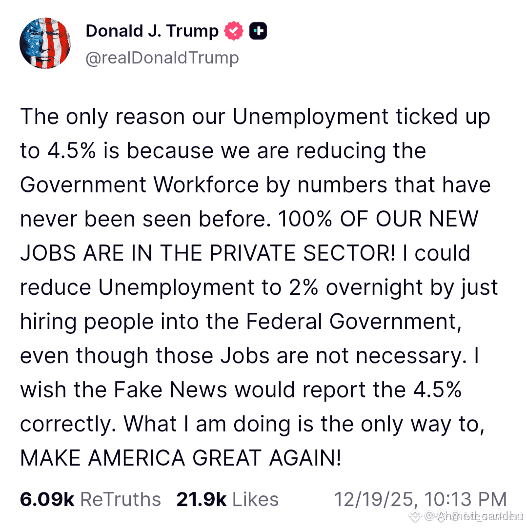 Donald J. Trump says unemployment at 4.5% is rising because government jobs are being cut, not because the economy is breaking. That detail changes how the data should be read.