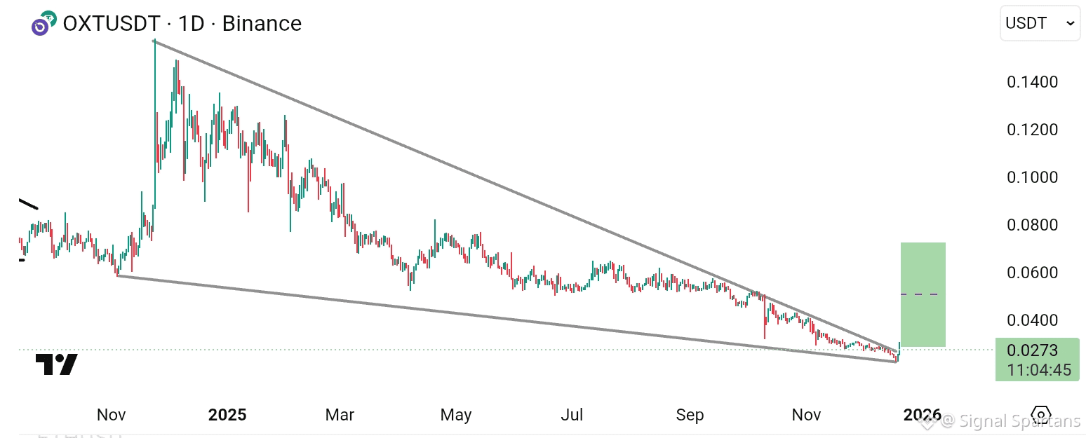 $OXT is forming a massive Falling Wedge 📈 on the Daily timeframe, currently holding strong support at 0.0273 USDT 🧠 after a prolonged downtrend.