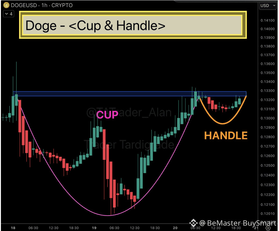 $DOGE Dogecoin is forming a bullish cup and handle pattern on the hourly timeframe, consolidating near $0.133 resistance after recovering from the $0.120 level.
