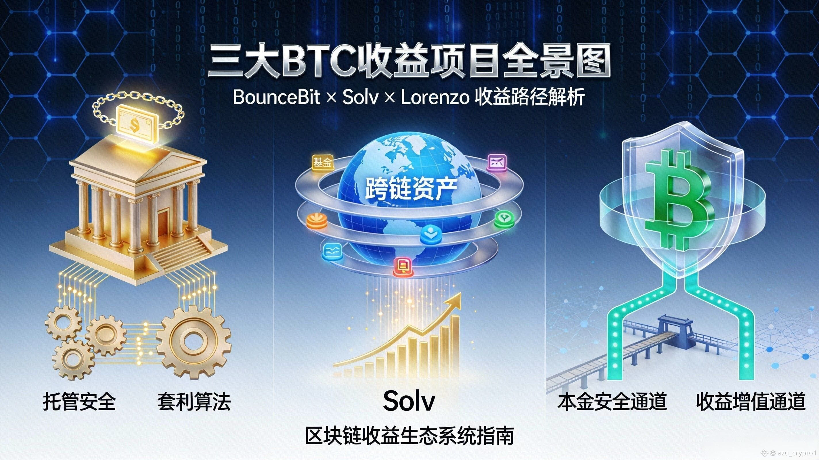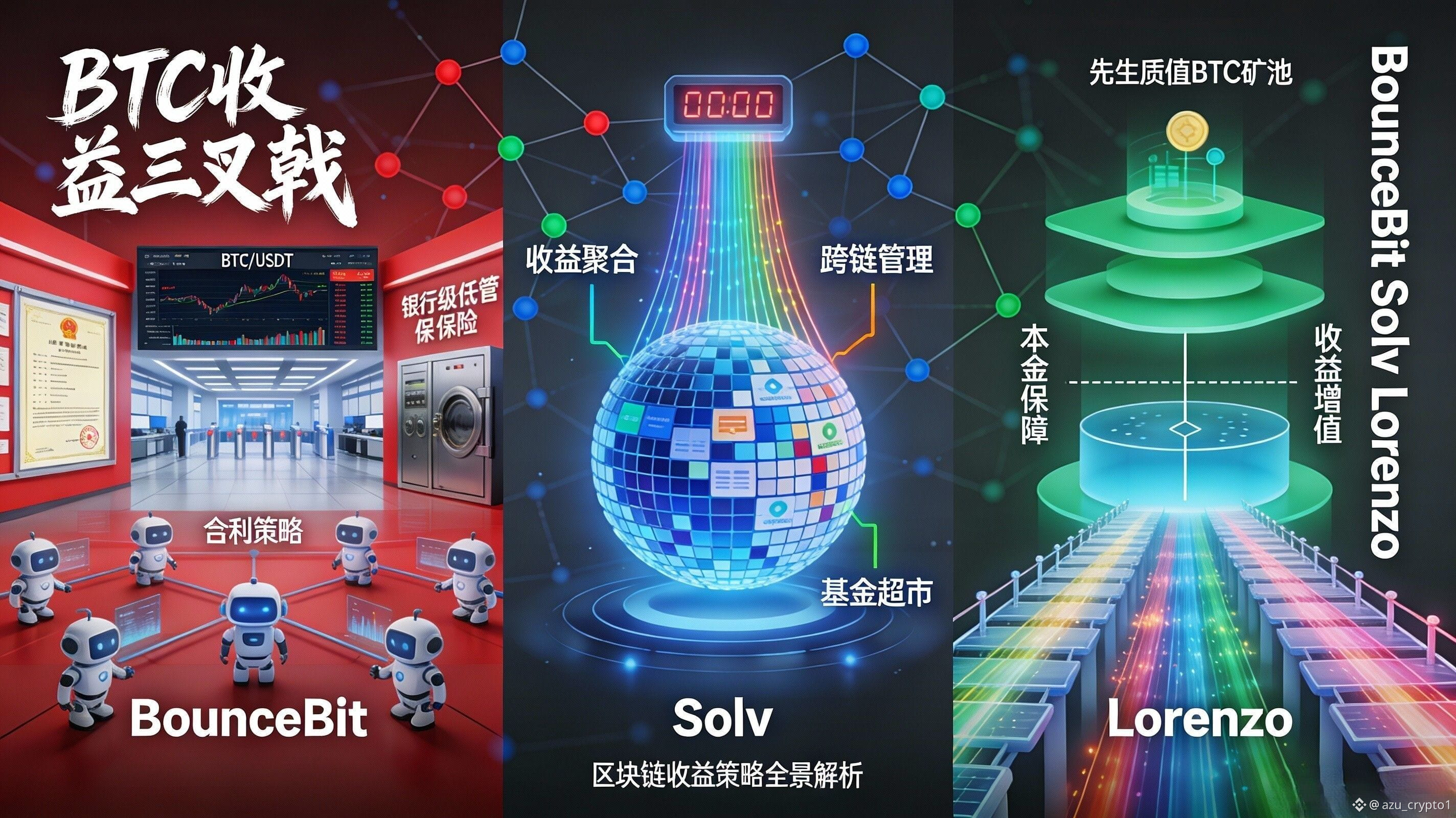 朋友们好,我是阿祖。现在聊 BTC 收益,很多人习惯把一堆项目塞进同一个“年化排行榜”,但这其实会把你带进误区:BounceBit、Solv、Lorenzo 不是同一类东西,它们解决的是三种不同的“BTC 资金需求”,收益从哪里来、风险落在哪一层、退出时会卡在什么环节,答案完全不一样。你如果先把分工和边界划清楚,再去选路径,胜率会高很多。