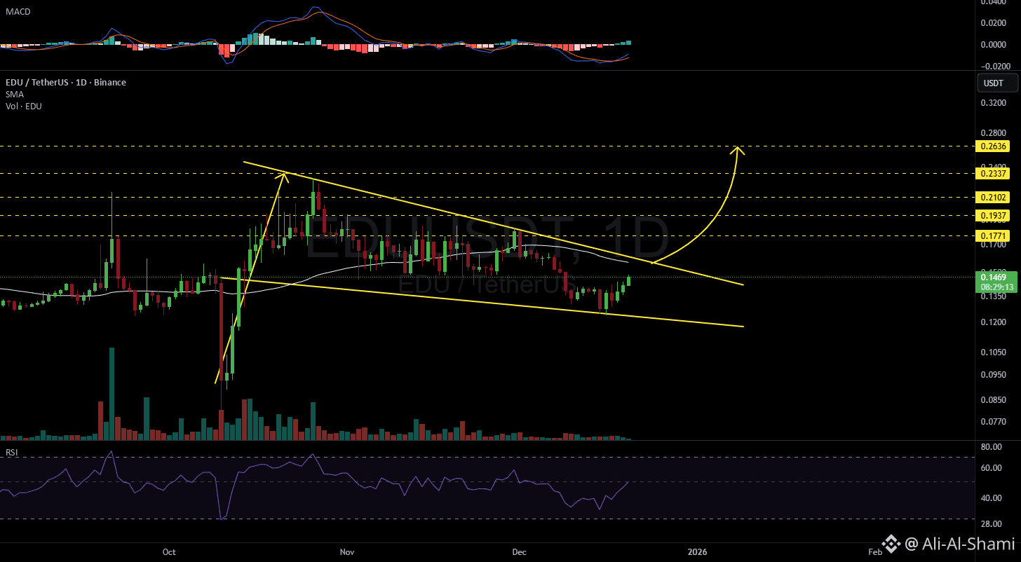 راقب الرسم البياني اليومي لـ #EDU عن كثب. يشير مؤشر القوة النسبية (RSI) ومؤشر MACD إلى موجة زخم صعودية. إذا اخترق السعر فوق الراية الصعودية ومتوسط الحركة اليومي SMA50، فإن الأهداف المحتملة للصعود هي: