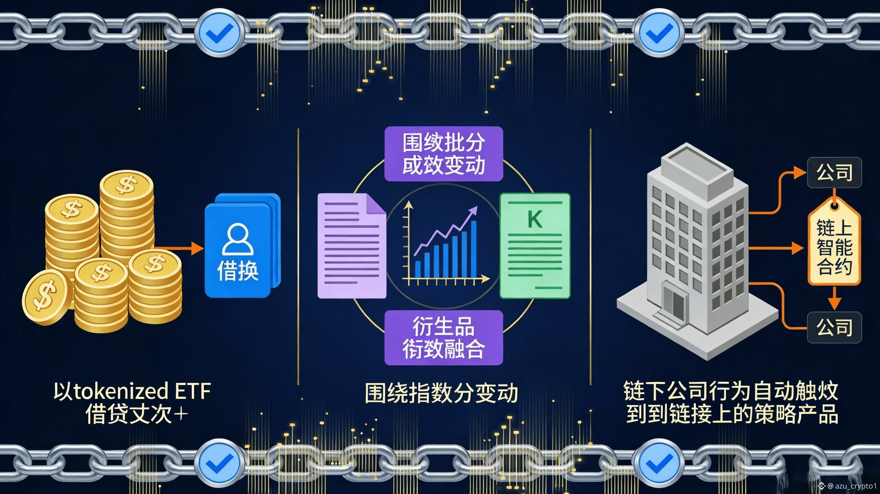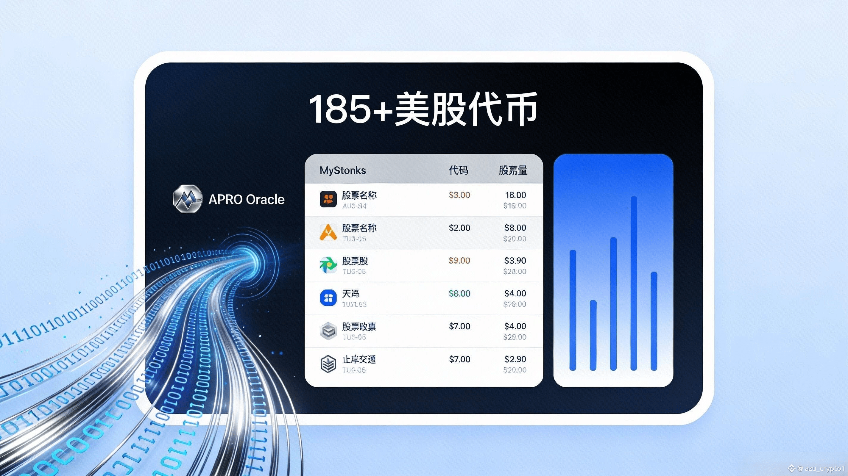 晚上好,各位。阿祖来了,聊股票/ETF 代币化我越来越确定一件事:真正决定这条赛道能不能走到“像证券市场那样严谨”的,不是你做了多顺滑的交易前端,也不是你把 K 线画得多像 TradingView,而是你有没有一条足够硬的“数据可信链”。因为股票/ETF 这种资产在链下的规则密度极高,价格只是表层,底层还有交易时段、停牌、拆股合股、分红、成分股调整、公告与披露、做市深度乃至合规约束;你如果只把它当成“换个壳的币”,最终会发现前端体验越好,出事故的时候越惨。