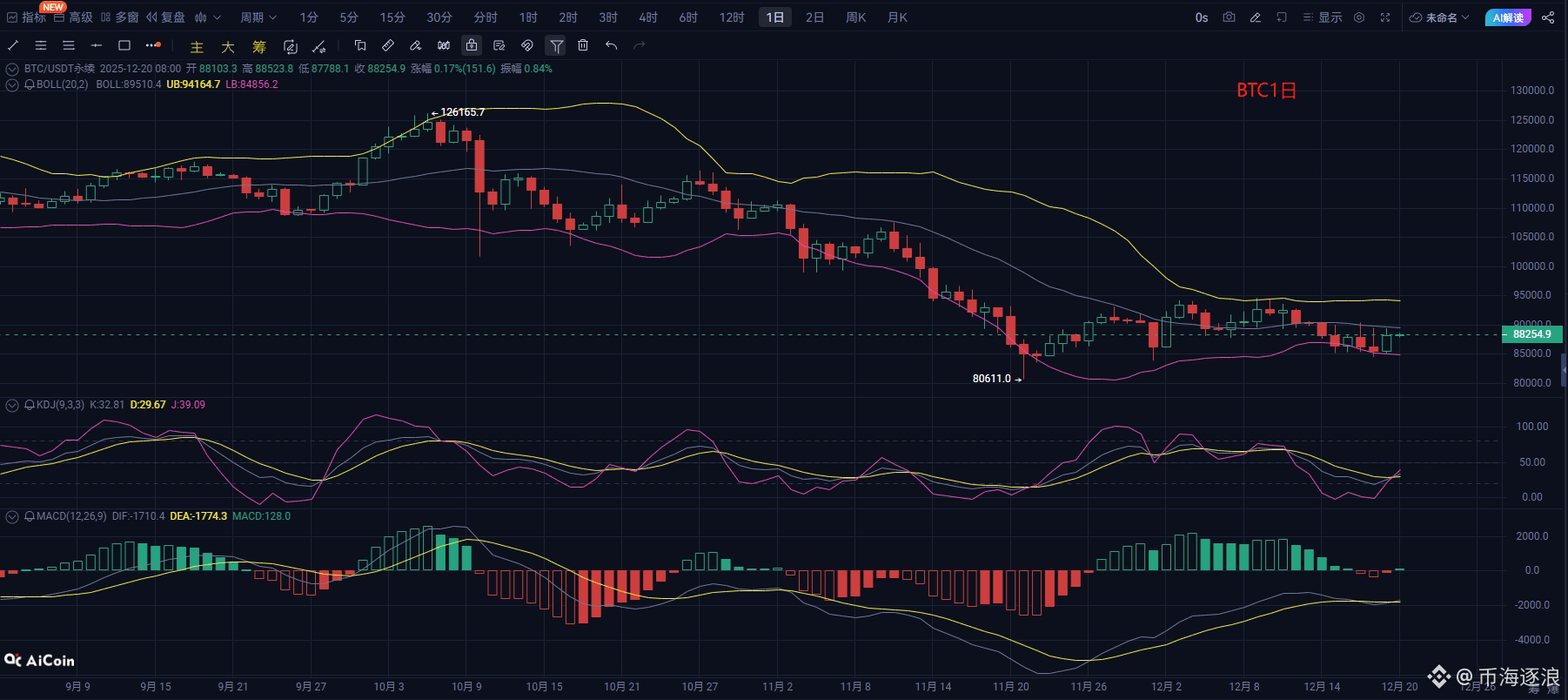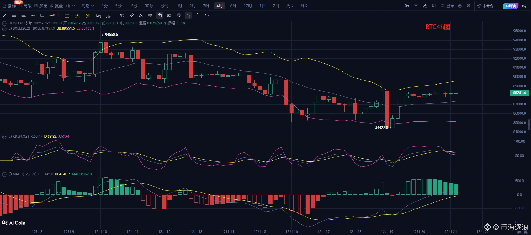 比特币日内延续窄幅震荡格局,价格始终围绕88000一线附近上下波动,整体维持盘整态势。从日级别图走势结构来看,BTC自10月起便处于下降通道内,EMA各均线同步向下运行,形成标准空头排列形态;近期价格持续受 EMA30 压制,反弹多次承压回落。指标层面,KDJ 已显现初步金叉迹象,但数值处于中性区间,信号力度偏弱,MACD能量柱由红转绿,快慢线形成低位金叉雏形,不过仍处于零轴下方,整体来看,中期趋势还是偏弱。
