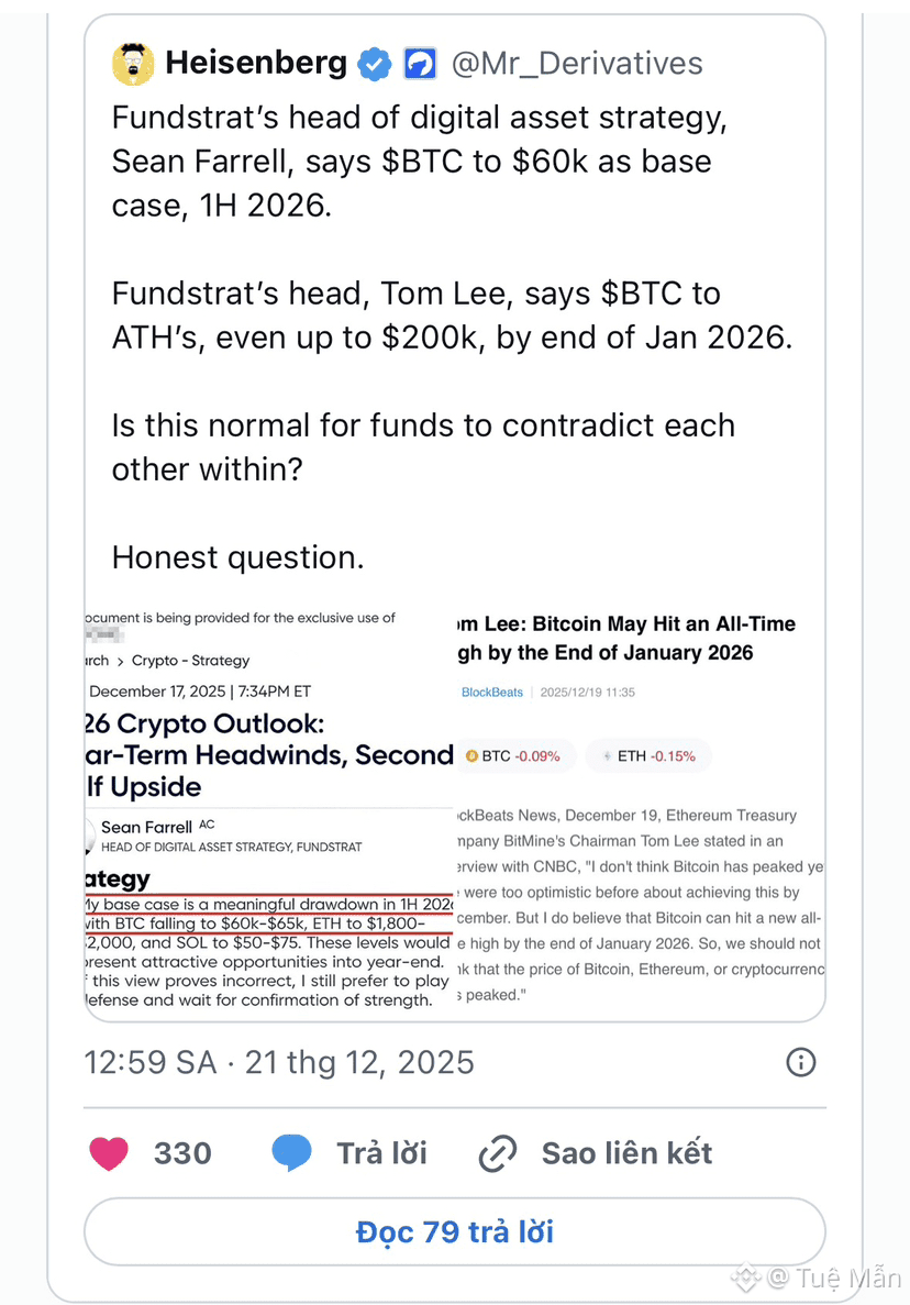 Cuộc thảo luận bắt đầu khi một người dùng X có biệt danh “Heisenberg” chia sẻ ảnh chụp màn hình mà anh cho là thể hiện các dự báo trái ngược từ lãnh đạo Fundstrat. Một bình luận nổi bật của Sean Farrell, Trưởng bộ phận chiến lược tài sản số của Fundstrat, nêu kịch bản cơ bản trong đó Bitcoin có thể điều chỉnh về vùng 60.000–65.000 USD trong nửa đầu năm 2026. Trong khi đó, một bình luận khác dẫn lời Tom Leegần đây cho rằng Bitcoin có thể đạt mức cao kỷ lục mới, có thể xảy ra sớm nhất vào đầu năm 2026.