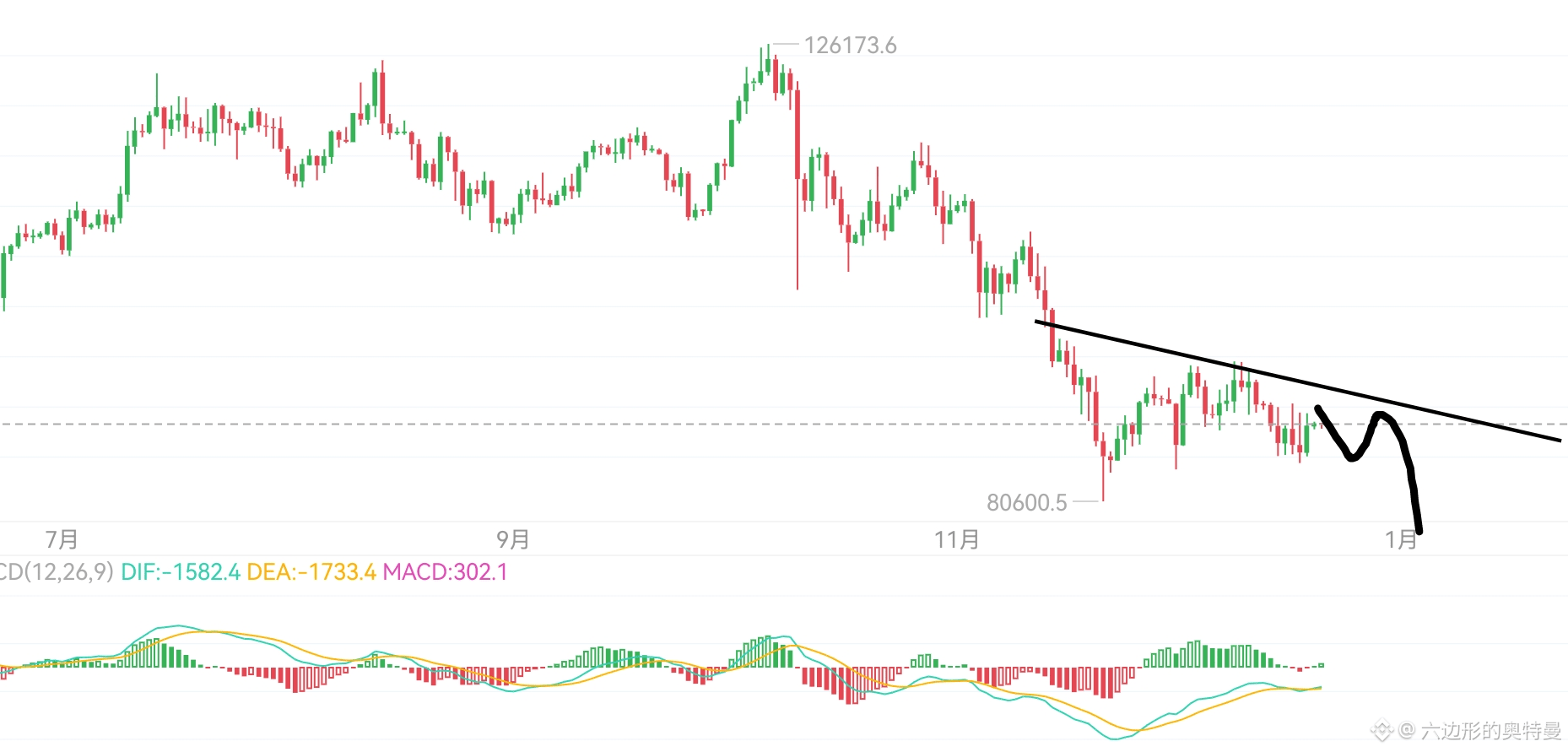 大饼压力还是集中于89500-90500,支撑86500-84500,宽幅震荡走势中。二饼就不谈,3000-3150都无法逾越,上方压力不破,拖了这么久的日线下行放量,在月尾环节很大概率完成2025年的惊鸿一笔。周六周天的波动很小,下周个人仍旧是以高空思路面对,继续主箜辅多。