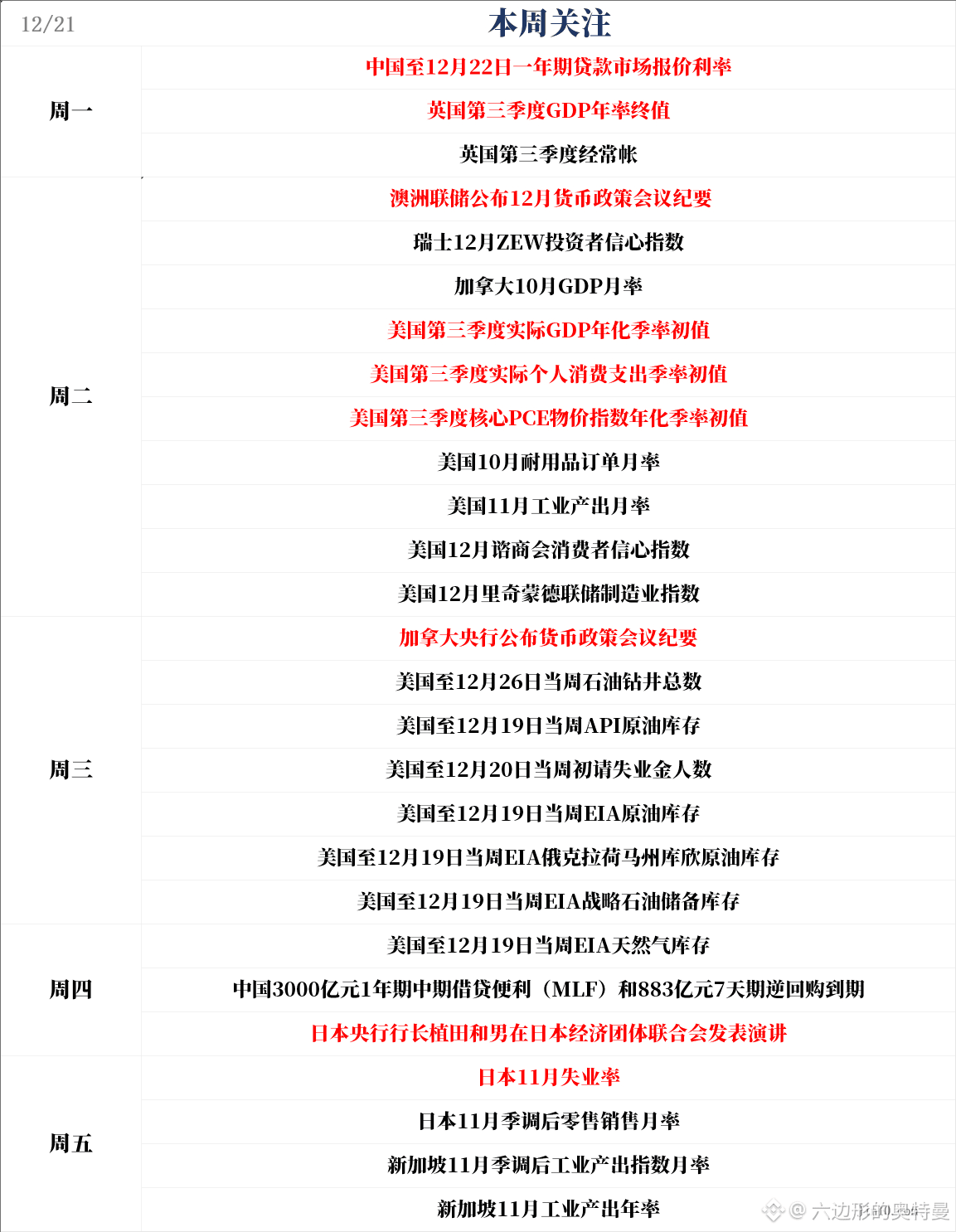 下周美国过圣诞节市场流动性减少的这个背景下,整体波动应该会小一点,数据没有特别重磅,那唯一需要紧盯的大事件就是日本央行值田的讲话,当然了还有一些其他的消息呢需要我们稍微的关注一下。