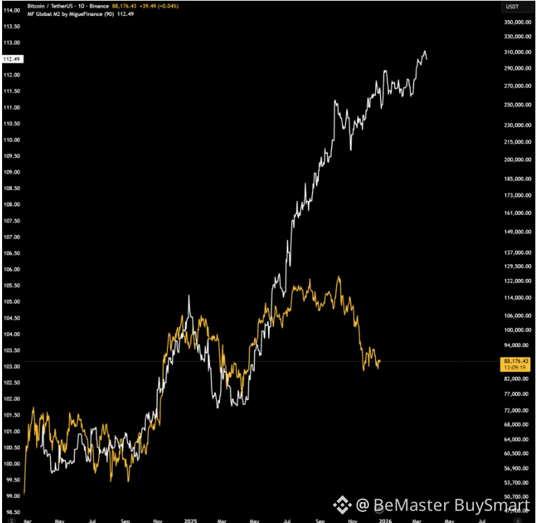 $BTC Bitcoin's price hasn't kept pace with surging global M2 liquidity. Recent chart analysis reveals a widening gap between the crypto's valuation and worldwide monetary expansion through early 2026.